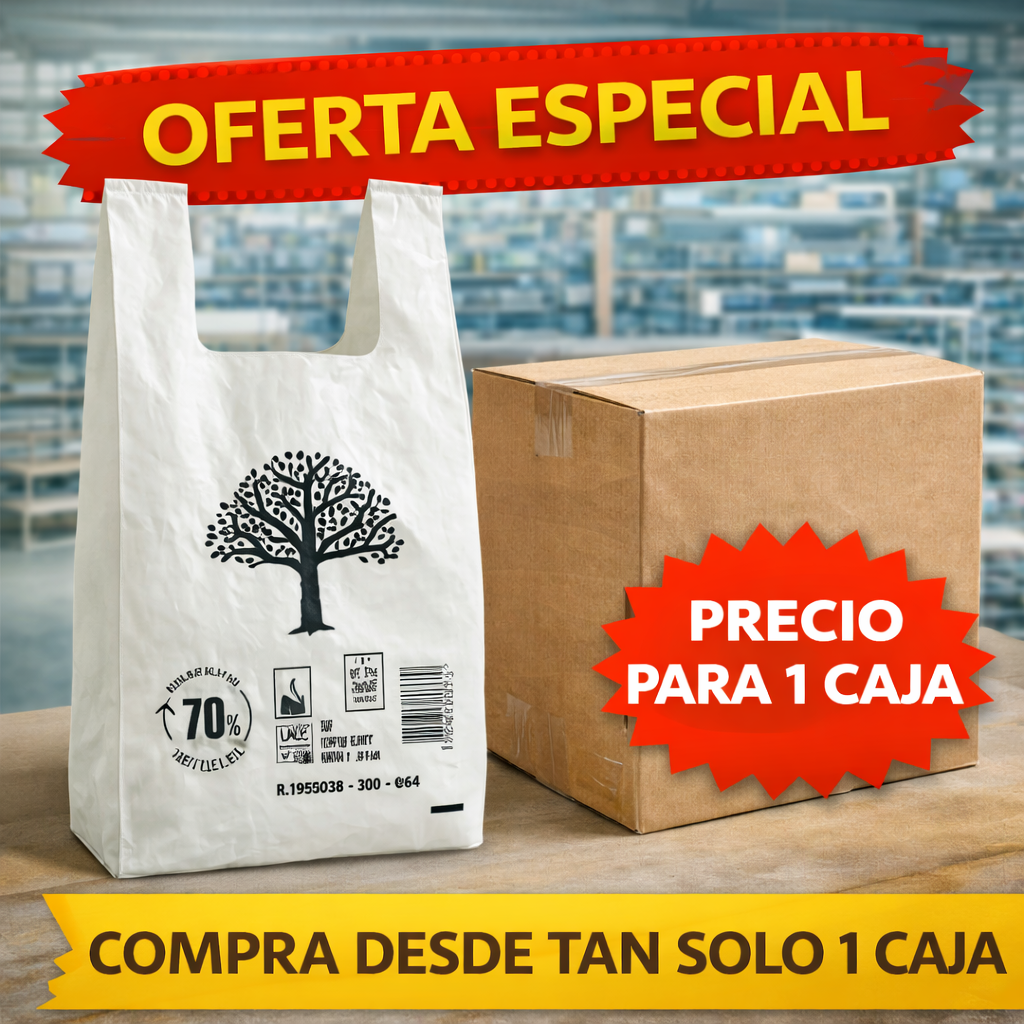 Fabricadas en polietileno de baja presión con +70% de material reciclado, cumplen normativa vigente y no están sujetas a cobro obligatorio, siendo ideales para negocios con alta rotación y productos de peso medio-alto.